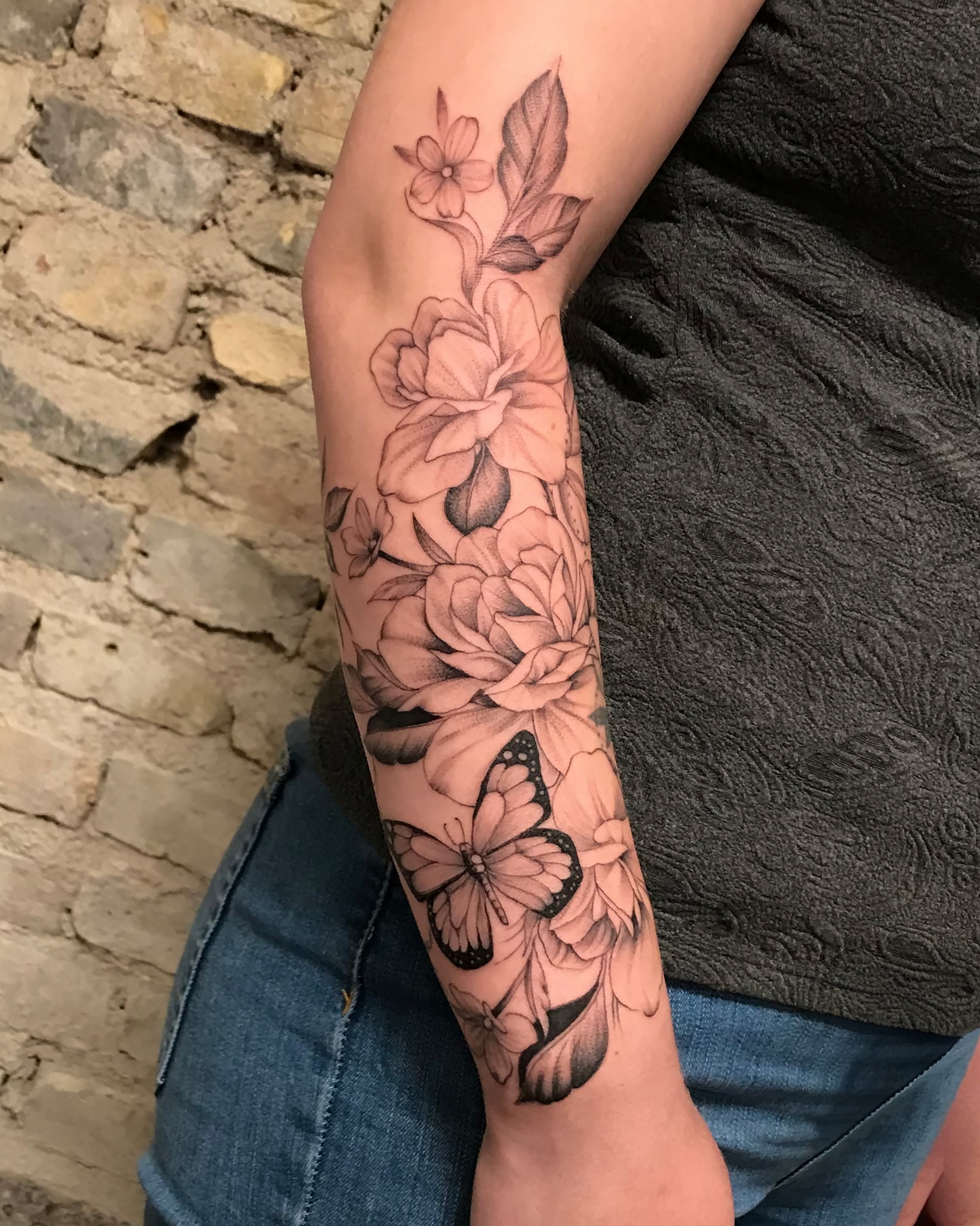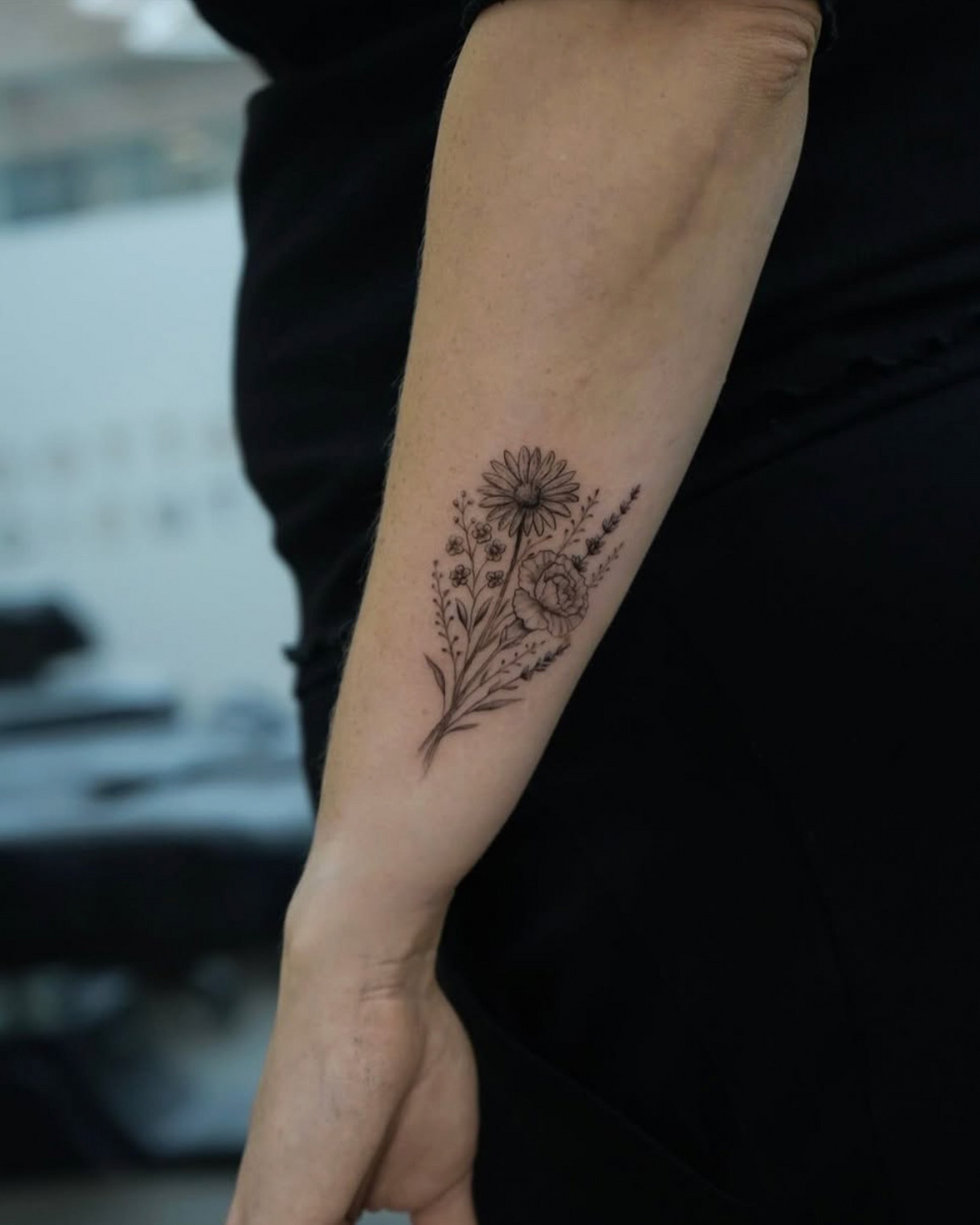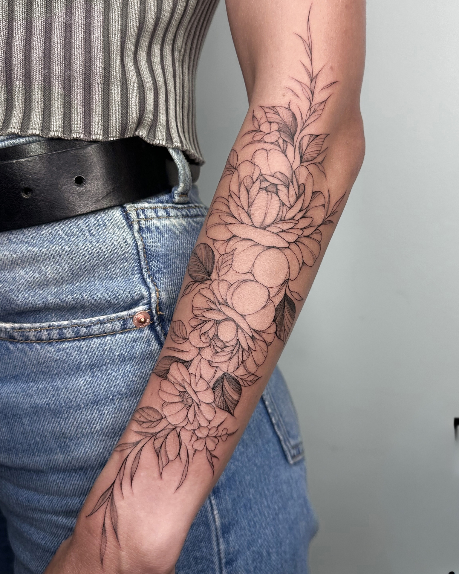 Floral tattoos focus on flowers, leaves, and organic shapes, ranging from realistic bouquets to more stylized, graphic designs.